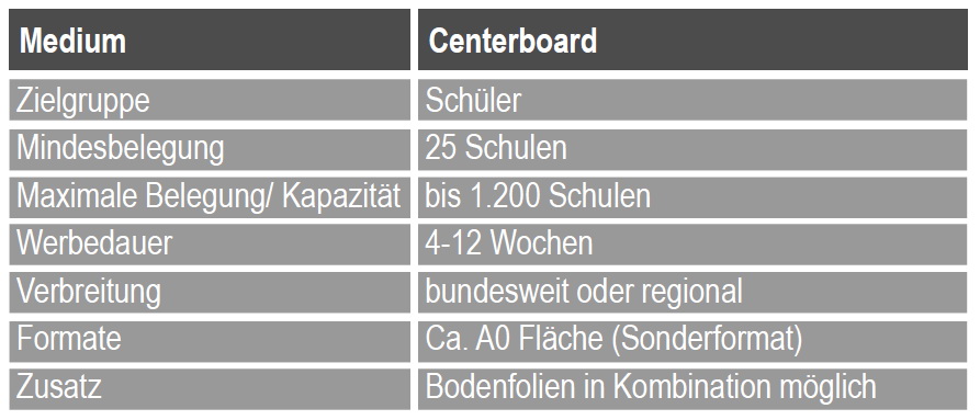 Mit centeboards (siehe Bild oben) können Sie über einen längeren Zeitraum in Schulturnhallen mit Ihrer Werbung auf Basketboard-Flächen präsent sein. Im Durchschnitt werden ca. 4 Flächen pro Schule belegt.Die belegte Fläche bei einem Basketboard beträgt ca. 1 qm.