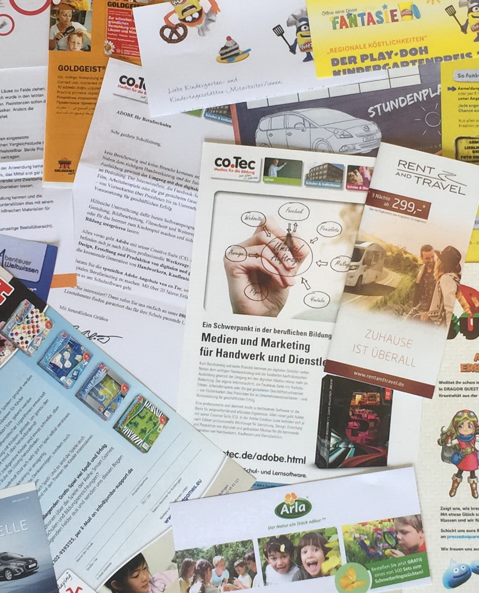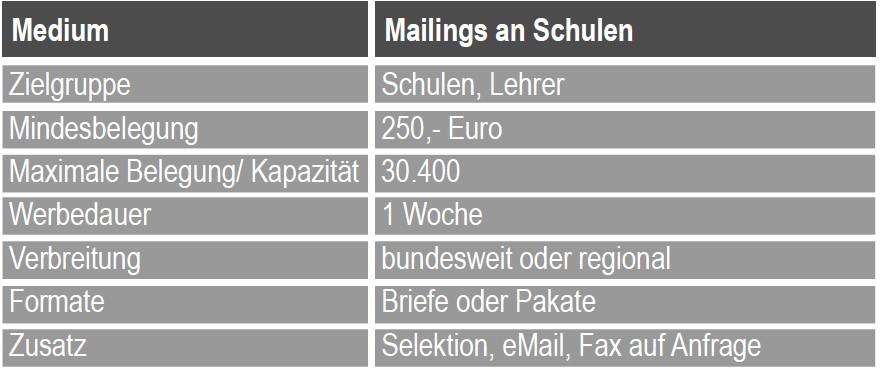 Wir können für unsere Kunden verschiedene Verteiler Nutzen und Mailings per Post oder per eMail durchführen. Neben den Daten fast aller Schulen und Kindergärten verfügen wir über verschiedene Spezialverteiler wie Schülerzeitungsredaktionen. Der Versand kann auch individualisiert werden. Es können einfache Briefe oder auch ganze Paketsendungen umgesetzt werden. Zur Umsetzung von Samplings und Mailings verfügen wir über ein großes eigenes Lager.