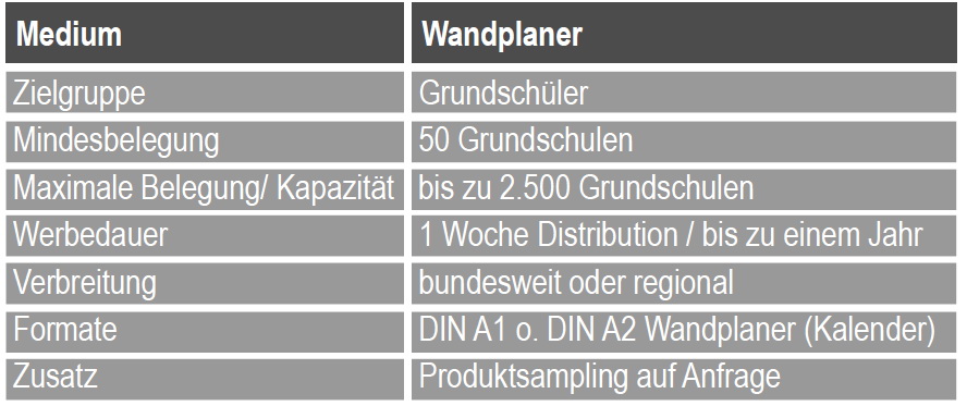 Wandplaner gibt es in verschiedenen Ausführungen und sind ein nützlicher Jahreskalender für Klassenräumen von Schulen. Der Wandplaner ist ein Poster im Querformat mit einem Jahreskalendarium, Ferienzeiten und Stundenplan. Er kann im jedem Klassenraum platziert werden um die Schüler – hier vor allem Grundschüler im Klassenverbund – auf wichtige Termine hinzuweisen. Alle wichtigen Schul- und Klassentermine, ggf. Geburtstage, die Stunden/ Fächer und natürlich die Ferien- und Feiertage sind aufgeführt. Um den Wandplaner herum gibt es viel Raum um die Lehrer und Schüler ein ganzes Jahr anzusprechen und zu inspirieren. Der Wandplaner kann nach Kundenvorgaben oder durch den Kunden selbst gestalltet werden. Wir sorgen für die Produktion der großen Plakate und statten die Partnerschulen in der Region oder Ort zu Ihrem Wunschtermin mit den Postern aus.